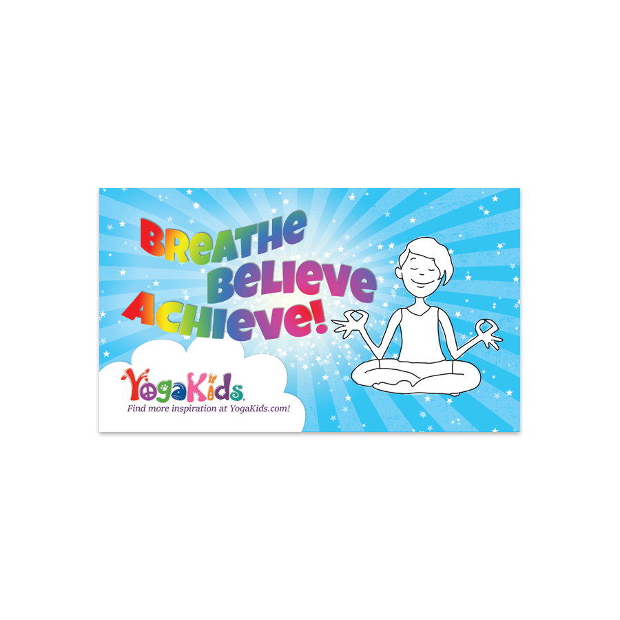 A newly sparkled and fun magnet to share with students or to use for marketing. It is 3.5 wide x 2 inches tall and has the recognizable YogaKids logo with an affirmation, “Breathe, Believe, Achieve”!